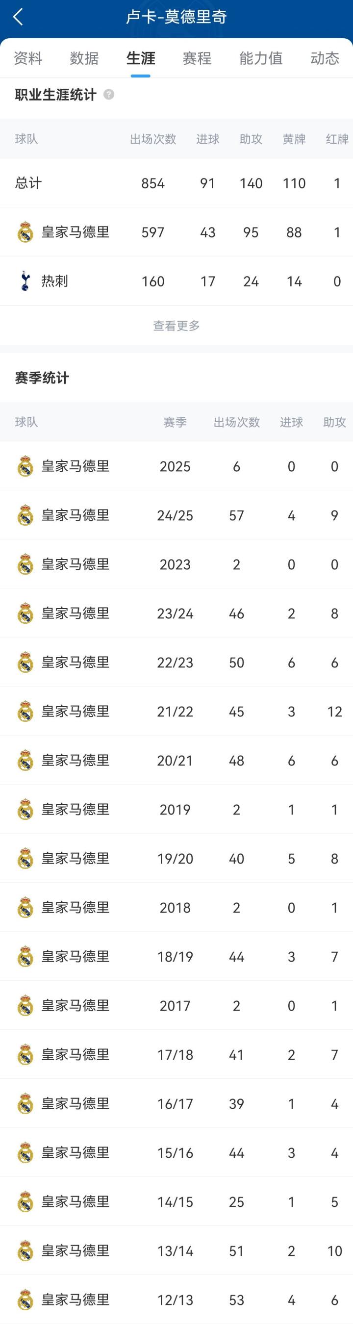 莫德里奇于2012年加盟皇马,效力13年共出战597场,打进43球助攻95次,帮助球队夺得28座冠军奖杯:6次欧冠、6次世俱杯、5次欧洲超级杯、4次西甲联赛、2次国王杯和5次西班牙超级杯。