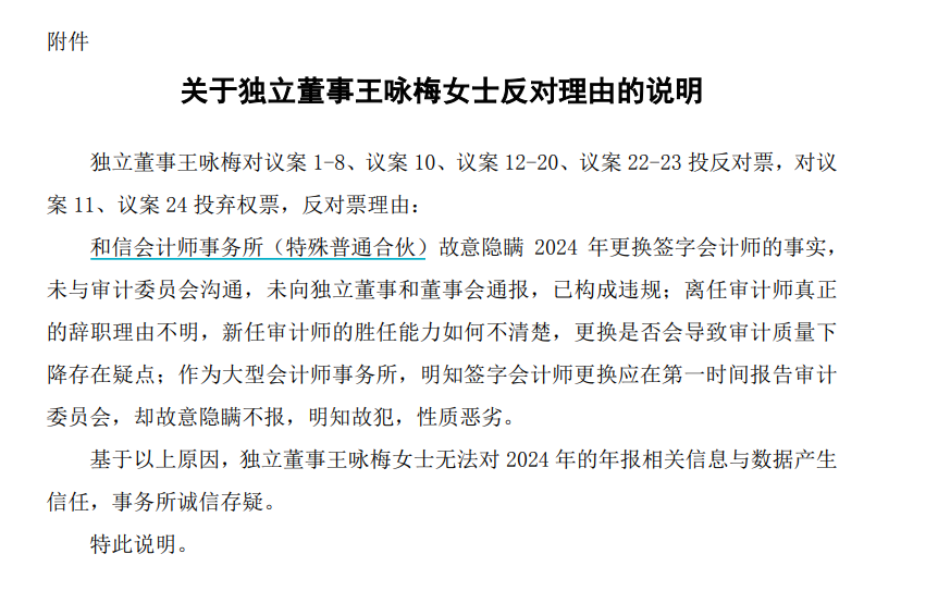 她给出的理由是:“和信会计师事务所(特殊普通合伙)故意隐瞒2024年更换签字会计师的事实,未与审计委员会沟通,未向独立董事和董事会通报,已构成违规;离任审计师真正的辞职理由不明,新任审计师的胜任能力如何不清楚,更换是否会导致审计质量下降存在疑点;作为大型会计师事务所,明知签字会计师更换应在第一时间报告审计委员会,却故意隐瞒不报,明知故犯,性质恶劣。”