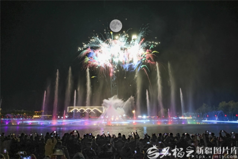 10月6日晚,新源县天鹅湖景区、大型激光水舞烟花秀与圆月同框。张文庭 摄